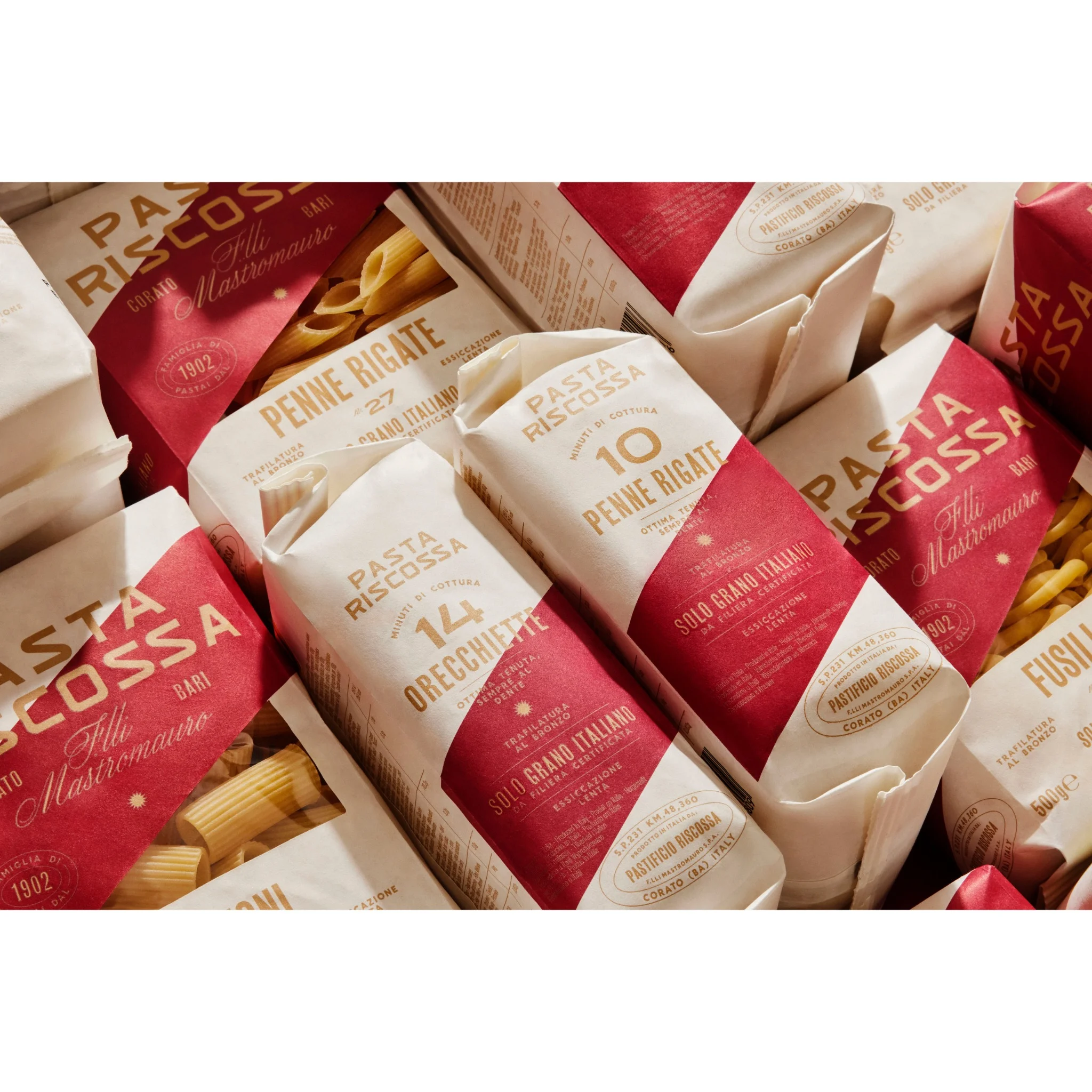 Seit 1902 steht der Name Riscossa für kompromisslose Qualität aus Apulien. Gegründet in Corato von Cavaliere Leonardo Mastromauro, ist das Unternehmen bis heute ein familiengeführter Betrieb in vierter Generation. Was einst als kleine handwerkliche Pastamanufaktur begann, entwickelte sich dank außergewöhnlicher Qualität schnell zu einer festen Größe – bereits früh wurden täglich über drei Tonnen Pasta produziert.